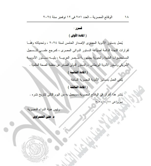 “يعمل بدستور الأدوية المصرى الإصدار الخامس لسنة ٢٠٢٤ ، وتحديثاته وفقا القرارات اللجنة الدائمة لصياغة الدستور الدوائي المصرى ، كمرجع علمي لتسجيل المستحضرات الطبية والحيوية بجمهورية مصر العربية ، يليه دستور الأدوية الأمريكي ودستور الأدوية البريطاني ، والدستور الدولي الصادر عن منظمة الصحة العالمية”.