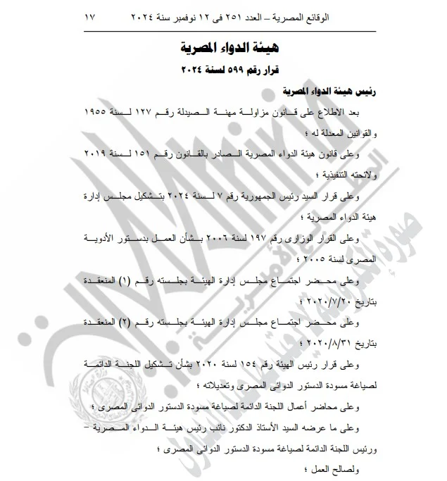 نشرت الجريدة الرسمية فى عددها رقم 251 الصادر اليوم الثلاثاء، قرار رئيس هيئة الدواء رقم 599 لسنة 2024 المتعلق بالعمل بدستور الأدوية المصري الإصدار الخامس لسنة 2024 وتحديثاته وفقا لقرارات اللجنة الدائمة لصياغة الدستور الدوائي المصري، كمرجع علمي لتسجيل المستحضرات الطبية والحيوية بجمهورية مصر العربية، يليه دستور الأدوية الأمريكي ودستور الأدوية البريطاني، والدستور الدولي الصادر عن منظمة الصحة العالمية.