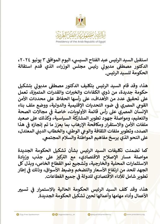 وقام الرئيس بتكليف الدكتور مصطفى مدبولي بتشكيل حكومة جديدة، من ذوي الكفاءات والخبرات والقدرات المتميزة، تعمل على تحقيق عدد من الأهداف، على رأسها الحفاظ على محددات الأمن القومي المصري في ضوء التحديات الإقليمية والدولية، ووضع ملف بناء الإنسان المصري على رأس قائمة الأولويات، خاصة في مجالات الصحة والتعليم.