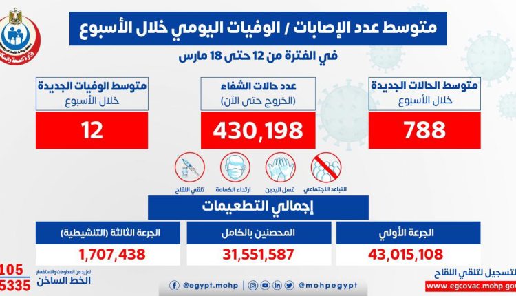 أعلنت وزارة الصحة والسكان، اليوم، السبت، أن متوسط عدد الاصابات اليومي بفيروس كورونا بلغ 788 إصابة وذلك خلال الأسبوع الماضي ضمن إجراءات الترصد والتقصي والفحوصات اللازمة التي تُجريها الوزارة وفقًا لإرشادات منظمة الصحة العالمية، لافتة إلى أن متوسط الوفيات اليومي بلغ 12 حالة جديدة.