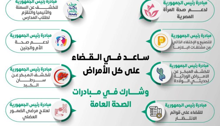 وأوضحت أن المبادرات الرئاسية ضمت العديد من التخصصات، حيث كان هناك مبادرة لدعم صحة المرأة، وأخرى للكشف عن السمنة والأنيميا والتقزم لطلاب المدارس، وثالثة للتصنيع والاكتفاء الذاتي من مشتقات البلازما، ورابعة لدعم صحة الأم والجنين، وخامسة للكشف المبكر عن الأمراض الوراثية لحديثي الولادة، وغيرهم للكشف المبكر عن سرطان الثدي، والقضاء على قوائم الانتظار، وعلاج مرضى الضمور العضلي، واكتشاف وعلاج ضعف وفقدان السمع للأطفال حديثي الولادة، وفحص وعلاج الأمراض المزمنة والكشف المبكر عن الاعتلال الكلوي.