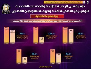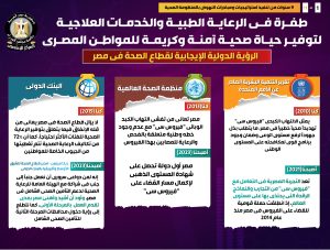 جاء ذلك في التقرير الذي نشره المركز الإعلامي تضمن إنفوجرافات تسلط الضوء على الطفرة التي شهدتها الرعاية الطبية والخدمات العلاجية لتوفير حياة صحية آمنة وكريمة للمواطن المصري، وذلك في ظل 9 سنوات من تنفيذ استراتيجيات ومبادرات النهوض بالمنظومة الصحية.