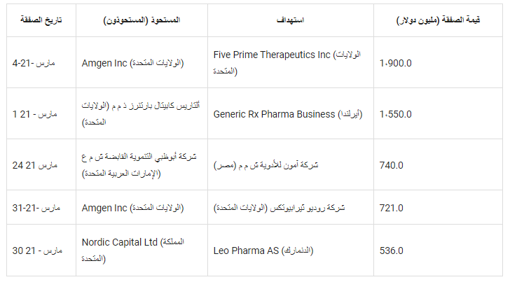 أول هذه الصفقات هي استحواذ شركة Amgen Inc الأمريكية، وهي شركة أدوية بيولوجية، على شركة Five Prime Therapeutics Inc ، وهي شركة للتكنولوجيا الحيوية في المرحلة السريرية مقابل 38 دولارًا أمريكيًا للسهم الواحد نقدًا، بقيمة إجمالية تبلغ حوالي 1900 مليون دولار.