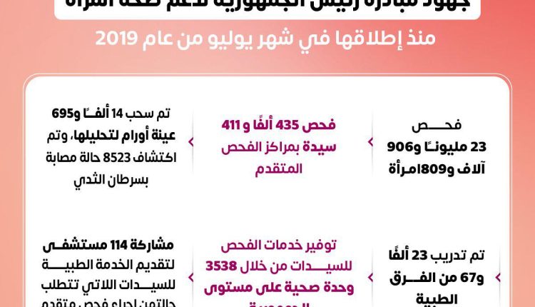 وأكدت وزارة الصحة في بيان سابق أنه تم توفير خدمات الفحص للسيدات بالمبادرة من خلال 3538 وحدة صحية على مستوى محافظات الجمهورية، بالإضافة إلى مشاركة 114 مستشفى لتقديم الخدمة الطبية للسيدات اللاتي تتطلب حالتهن إجراء فحص متقدم، لافتًا إلى أنه يمكن معرفة أماكن تلك الوحدات من خلال الموقع الرسمي للمبادرة http://www.100millionseha.eg ، بالإضافة إلى تلقي الاستفسارات من خلال الخط الساخن لمبادرة 100 مليون صحة على الرقم 15335.