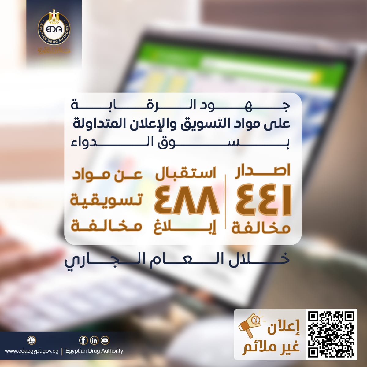 يأتي ذلك في ضوء حرص هيئة الدواء المصرية على تنفيذ عمليات الرصد والمتابعة الدورية، واستقبال الشكاوى والبلاغات المتعلقة بالمواد التسويقية المخالفة، واتخاذ الإجراءات الرقابية اللازمة من أجل ضمان وصول المعلومات الصحيحة والموثوقة والمحدثة والمحايدة وغير المُضَلِلَة للمواطنين بشكل مقبول ومناسب لجميع فئات المجتمع.