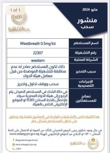 كما أصدرت هيئة الدواء منشورا رسميا لها آخر بسحب علاج Westbreath 0.5mg FCTsolution، وقالت هيئة الدواء جرى سحب العلاج، بسبب أن التشغيلة الخاصة بيه غير مطابقة لمعامل هيئة الدواء.