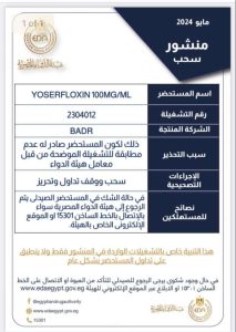 أعلنت هيئة الدواء المصرية، عن سحب ووقف تداول المضاد الحيوي YOSERFLOXIN من الأسواق، لعدم مطابقة التشغيلة الخاصة به لمعامل الهيئة