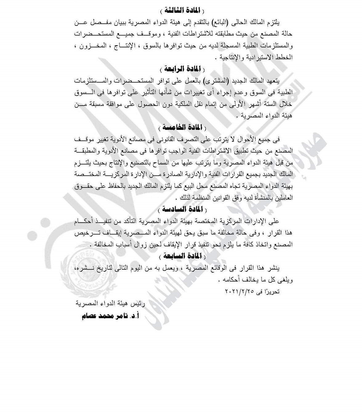 ونصت المادة الرابعة من القرار، «يتعهد المالك الجديد (المشترى) بالعمل على توافر المستحضرات والمستلزمات الطبية فى السوق وعدم إجراء أى تغييرات من شأنها التأثير على توافرها فى السوق خلال الستة أشهر الأولى من إتمام نقل الملكية دون الحصول على موافقة مسبقة من هيئة الدواء المصرية».