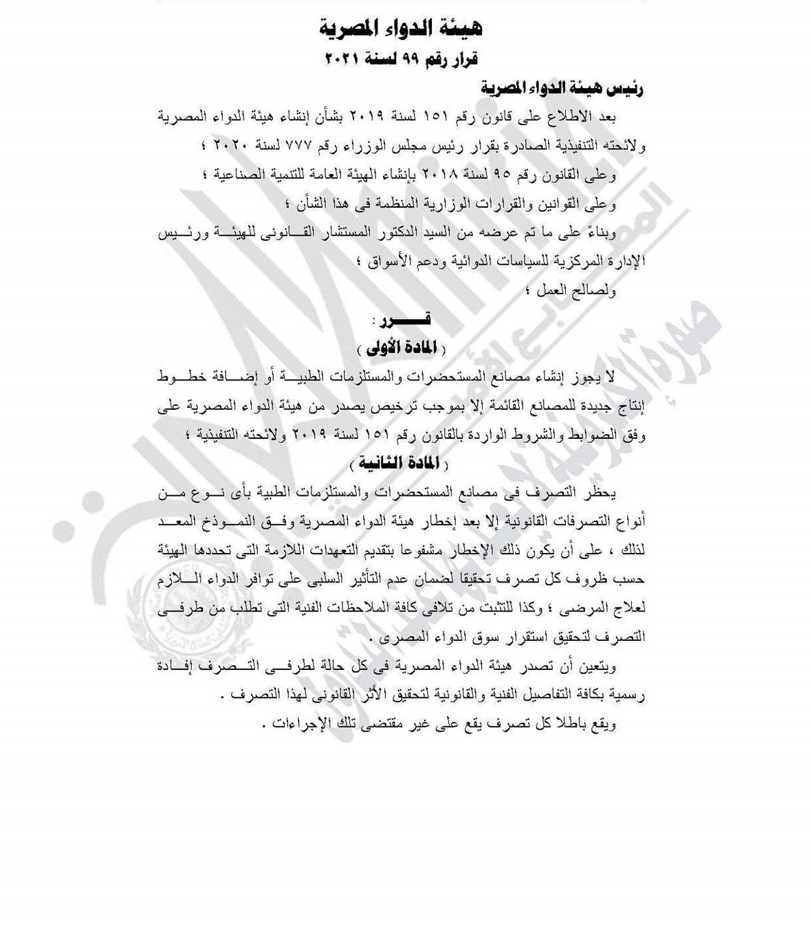 أصدرت هيئة الدواء المصرية قرارا رقم 99 لسنة 2021، والذي يحدد شروط إنشاء مصانع الأدوية والمستلزمات الطبية أو إضافة خطوط إنتاج جديدة وكذلك التصرف في مصانع قائمة .
