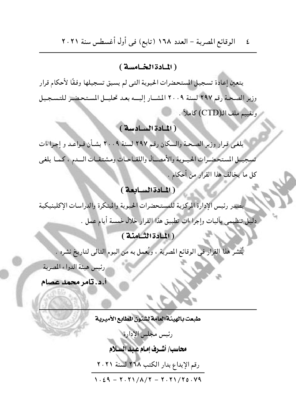 أصدرت هيئة الدواء المصرية القرار رقم (٣٤٣) لسنة ٢٠٢١، بشأن قواعد وإجراءات تسجيل المستحضرات الحيوية والأمصال واللقاحات ومشتقات الدم؛ والذي تم نشره بجريدة الوقائع الرسمية الرسمية بالعدد (١٦٨ تابع) لسنة ٢٠٢١ أمس الأحد.