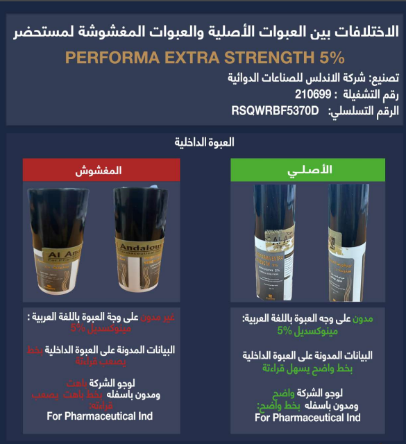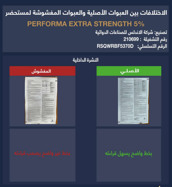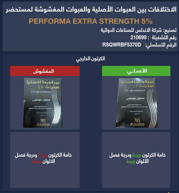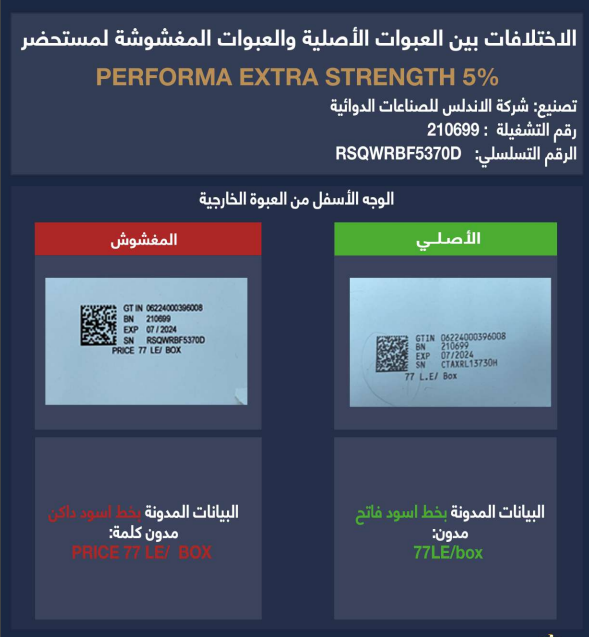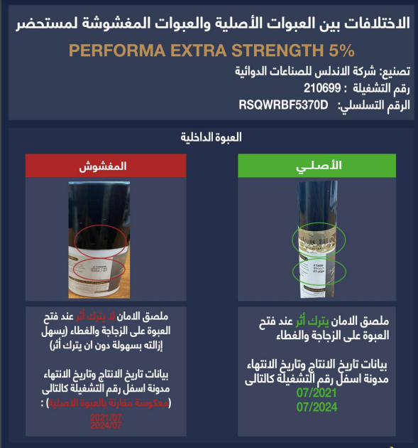 كما أصدرت هيئة الدواء منشور دوري رقم 14 لعام 2022، والذي جاء فيه أنه تقرر ضبط عبوات بها غش تجاري من عقار «PERFORMA EXTRA STRENGTH 5%».