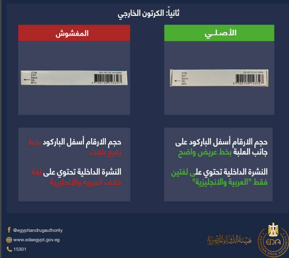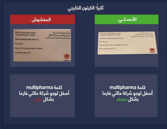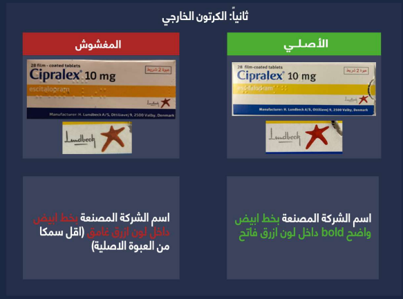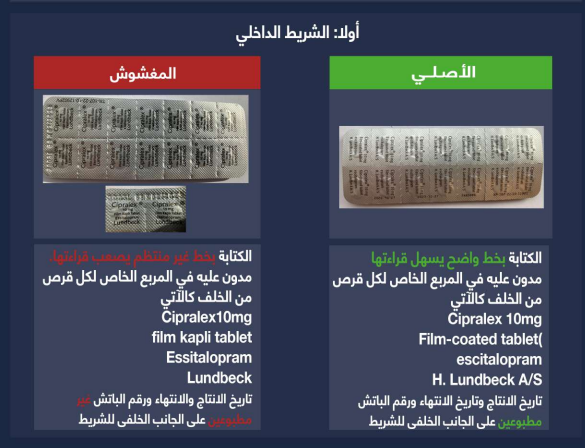 وأوضح القرار رقم 13 الخاص بمستحضر «Cipralex 10mg» أنه يمكن التفرقة بين العبوات السليمة والمغشوشة ظاهريا كما هو موضح في الصور التالية: