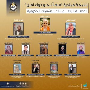 وجاء على رأس الصيادلة الأول بالدفعة الرابعة من المستشفيات الحكومية، ريم خليل محمد خليل، صيدلية مركز أورام قنا بمحافظة قنا، فيما جاءت بالمركز الثاني فاطمة الزهراء عطية حامد محمد، مستشفى المنصورة الدولي بمحافظة الدقهلية، وفي المركز الثالث نرمين السيد مجدي حامد أحمد الحسيني، مستشفى المنصورة الدولي بمحافظة الدقهلية، فيما حصد المركز الرابع علا هشام منصور، مركز أورام قنا بمحافظة قنا، والمركز الخامس إسراء أحمد عبد المنعم محمد، مستشفى القوصية المركزي بمحافظة أسيوط، وجاءت بالمركز السادس سماح السيد عبد الرحيم حامد محمد، مستشفى صدر المنصورة بمحافظة الدقهلية.
