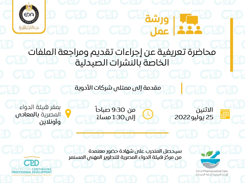 من المقرر انعقاد ورشة العمل يوم الاثنين الموافق ٢٠٢٢/٧/٢٥ بمقر هيئة الدواء المصرية بالمعادى، وعبر إحدى المنصات الإلكترونية.