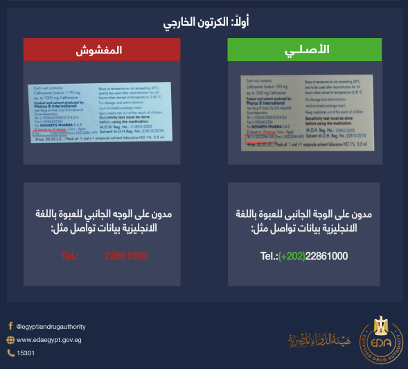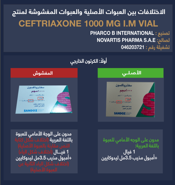 أصدرت هيئة الدواء منشورا دوريا حمل رقم 11 لسنة 2022 “غش تجاري”، وطالبت فيه بضبط وتحريز العبوات غير المطابقة للمواصفات والمقلدة والمغشوشة بالتشغيلة رقم 046203721 من المستحضر CEFTRIAXONE 1000 MG I.M VIAL الذي يتم تصنيعه بمصانع شركة “فاركو انترناشيونال”، لصالح شركة “نوفارتس” المالكة للمستحضر.