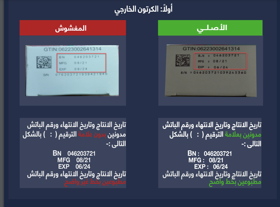 وأوضحت الهيئة في بيانها، للمواطنين إمكانية التفرقة بين العبوات الأصلية والمغشوشة ظاهريا كما هو موضح في الصور التالية: