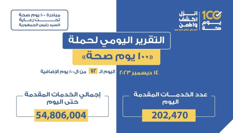 وقال إن حملة «100 يوم صحة» قدمت خدمات مبادرة الرئيس لفحص الأورام السرطانية (البروستاتا – القولون- الرئة – عنق الرحم) بملئ مليونين و387 ألفا و154 استمارة استبيان، مضيفا أن إجمالي المترددين على القوافل الطبية، بلغ مليون و541 ألفا و803 مواطنين.