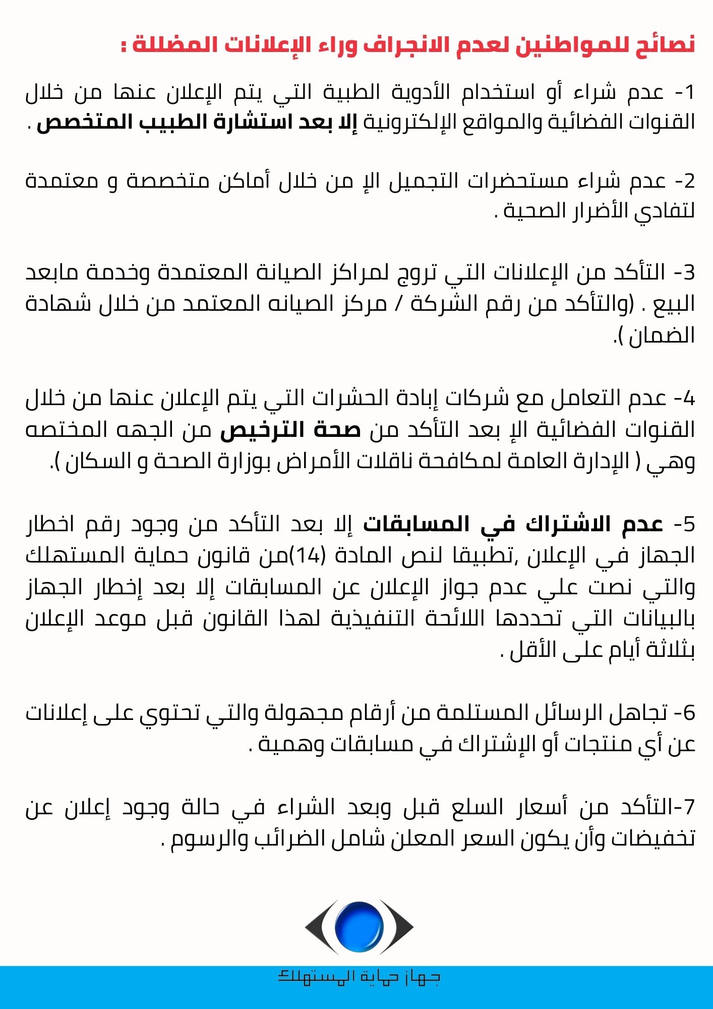 قدم جهاز حماية المستهلك عددا من النصائح المهمة للمواطنين لحمايتهم من خطر الإعلانات المضللة ولعدم الانجراف وراءها.