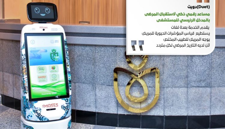 وأشارت الهيئة أن هناك روبوت أطلق عليه دويت “Duet” وهو يعمل على استقبال المرضى بالمدخل الرئيسي للمستشفى ويقدم الخدمة بعدة لغات، ويمكنه قياس المؤشرات الحيوية للمريض، وتوجيه المريض للطبيب المختص.