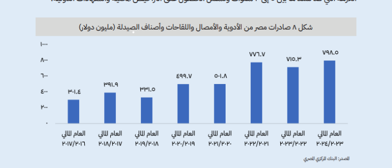 وقـد شـهدت صادراتهـا مـن الأدويـة والأمصـال واللقاحـات وأصنـاف الصيدلـة نمـًًوا ملحوًظـا، حيـث ارتفعـت مـن نحـو 301.4 مليـون دولار في 2017/2016 إلى 798.5 مليـون دولار بنهايـة ،2024/2023، محققـة معـدل زيـادة بلـغ .%164.6 ومـع ذلـك، مـا زالـت هنـاك تحديـات تواجـه المصدريـن، أبرزها طول فترة التأسـيس اللازمـة والتي قـد تمتـد مـا بين 5 إلى 10 سـنوات وتشـمل الحصـول علـى التراخيـص المحليـة والشـهادات الدوليـة.