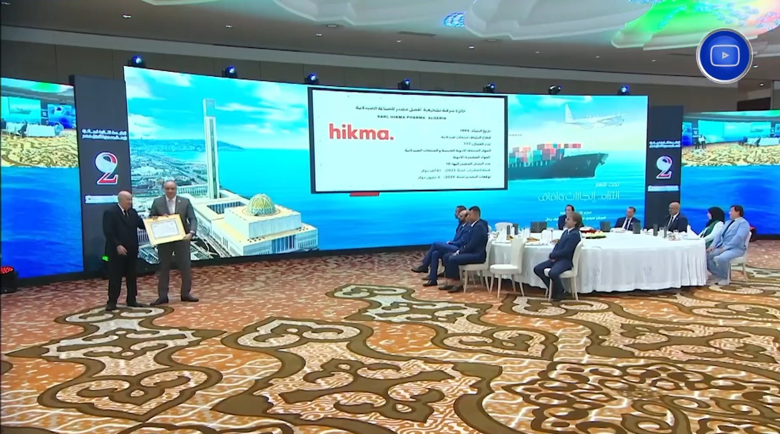 وتسلم الجائزة محمد أنيس بوضياف مدير المبيعات والتسويق بشركة ”حكمة فارما الجزائر”، خلال حفل التكريم الذي أقيم بالمركز الدولي للمؤتمرات عبد اللطيف رحال، بالجزائر العاصمة، وذلك بحضور عدد من قيادات الدولة وأعضاء من الحكومة وممثلي جمعيات مهنية ومسؤولي مؤسسات عمومية وخاصة.