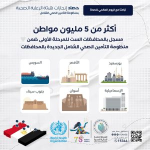 وأبرزت الهيئة، من خلال الانفوجراف إنجازاتها منذ إطلاق منظومة التأمين الصحي الشامل بمحافظة بورسعيد في يوليو 2019 وحتى الآن،  مشيرة إلى تسجيل أكثر من 5 مليون مواطن حتى الآن، وذلك بالمحافظات الست للمرحلة الأولى ضمن منظومة التأمين الصحي الشامل وتشمل محافظات (بورسعيد، الأقصر، الإسماعيلية، جنوب سيناء، أسوان، السويس).