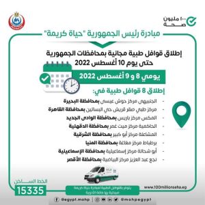 أعلنت وزارة الصحة والسكان، إطلاق 8 قوافل طبية ضمن مبادرة رئيس الجمهورية “حياة كريمة”، وذلك يومي 8 و9 أغسطس الجاري.