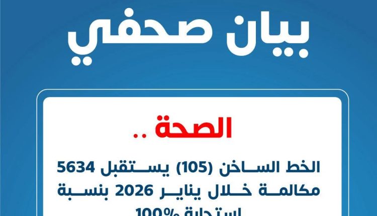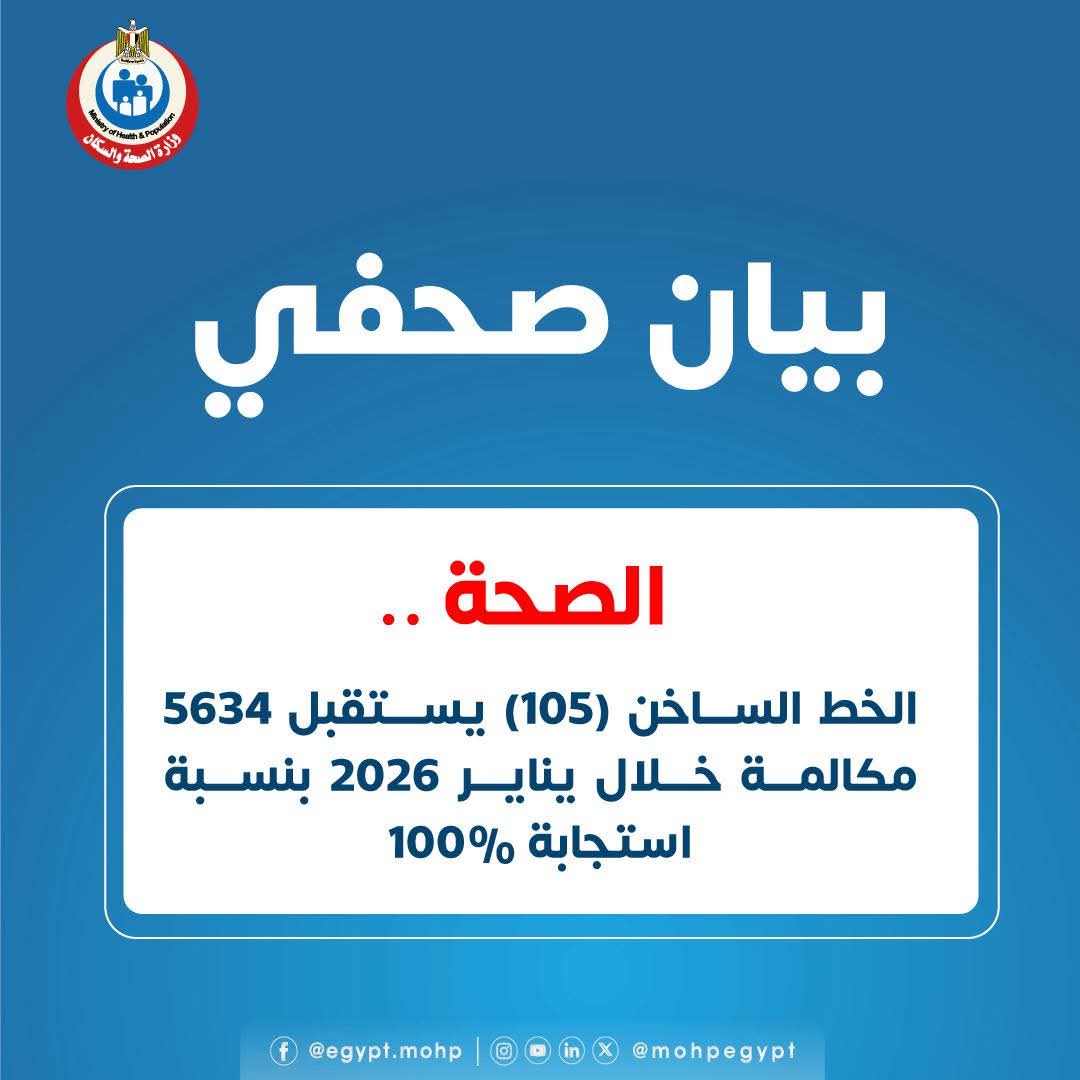 أعلنت وزارة الصحة والسكان استقبال 5634 مكالمة عبر الخط الساخن الموحد (105) خلال شهر يناير 2026، محققة نسبة استجابة كاملة بلغت 100% لجميع الاتصالات، في إطار تعزيز كفاءة المنظومة الصحية وتسهيل التواصل مع المواطنين تنفيذًا لتوجيهات الدكتور خالد عبدالغفار وزير الصحة والسكان.