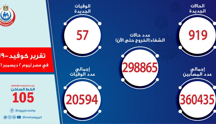 وأوضح الدكتور حسام عبد الغفار المتحدث الرسمي لوزارة الصحة والسكان، أنه تم تسجيل 919 حالة جديدة ثبتت إيجابية تحاليلها معمليًا للفيروس، وذلك ضمن إجراءات الترصد والتقصي والفحوصات اللازمة التي تُجريها الوزارة وفقًا لإرشادات منظمة الصحة العالمية، لافتًا إلى وفاة 57 حالة جديدة.