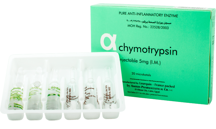 تستخدم حقن الفاكيموتريبسين – AlphaChymotrypsin كمضاد للإلتهابات وإزالة التورم الموضعي عقب العمليات الجراحية.