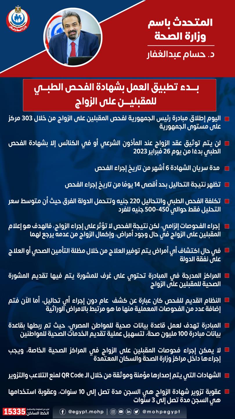 أعلن الدكتور حسام عبد الغفار المتحدث الرسمي باسم وزارة الصحة والسكان بدء تطبيق العمل بشهادات الفحص الطبي للمقبلين على الزواج من اليوم 26 فبراير 2023.