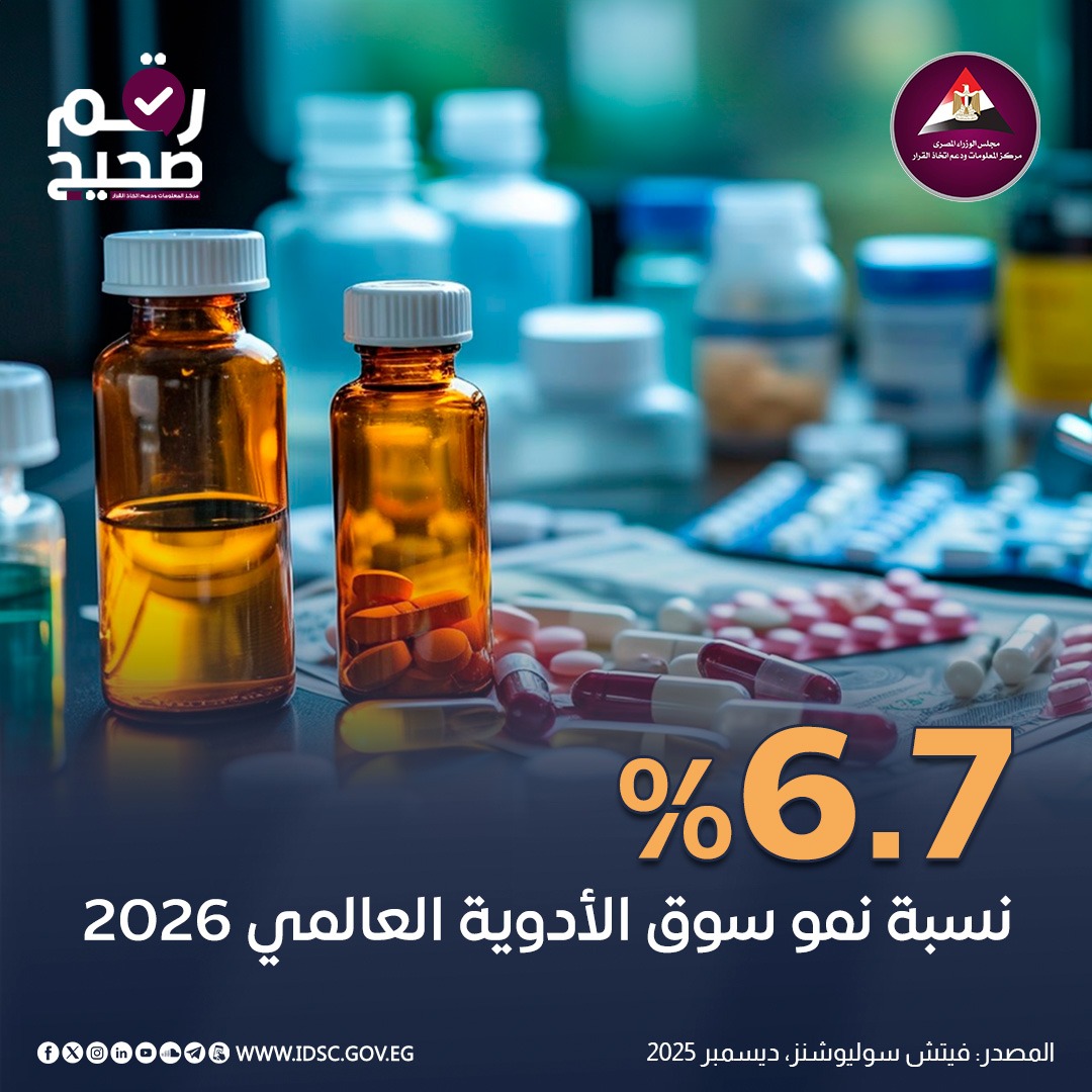 قال مركز المعلومات ودعم اتخاذ القرار بمجلس الوزراء، أن مؤسسة فيتش العالمية للتصنيف الائتماني أصدرت تقريرا حول توقعاتها لسوق الدواء العالمي في 2026، متوقعة تحقيق نموا بنسبة 6.7% (بالقيمة الدولارية) خلال العام المقبل.