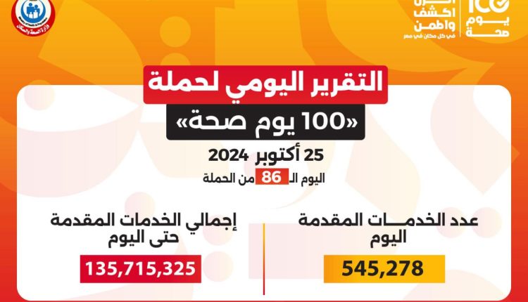 أعلن الدكتور خالد عبدالغفار نائب رئيس مجلس الوزراء ووزير الصحة والسكان، تقديم 135 مليون و715 ألفاً و325 خدمة طبية من خلال حملة «100 يوم صحة» منذ إطلاق الدكتور مصطفى مدبولي رئيس مجلس الوزراء، للنسخة الثانية، مساء يوم 31 يوليو 2024، وحتى مساء أمس الجمعة 25 أكتوبر، وفي إطار مبادرة الرئيس عبدالفتاح السيسي، «بداية جديدة لبناء الإنسان».