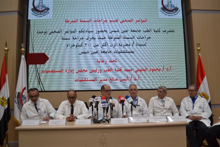 نظمت كلية الطب جامعة عين شمس وقسم جراحات السمنة مؤتمر صحفى اليوم، لإعلان نتائج الجراحة التى أجريت اليوم للمريضة أميمة صلاح والتى تزن 300 كيلو جرام، حيث تم إجراء عملية تحويل المعدة المعدل بالمنظار خلال ساعة واحدة فقط.