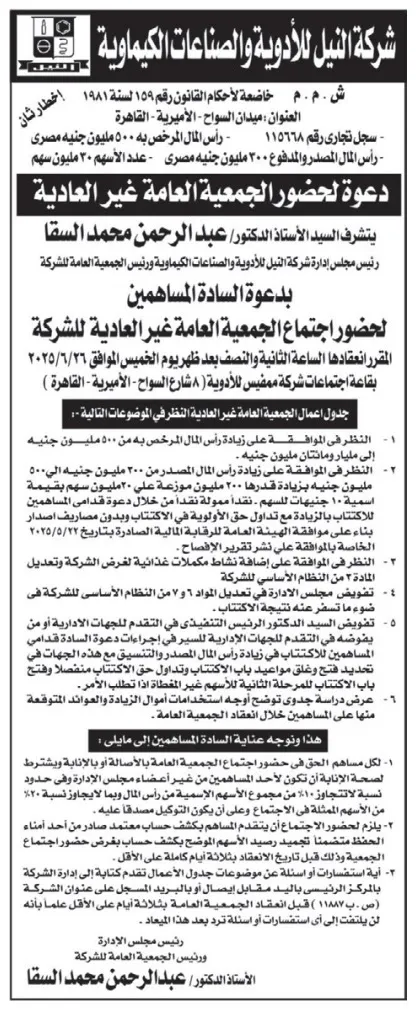 «عمومية النيل للأدوية» تناقش زيادة رأس المال وإضافة المكملات لنشاط الشركة الخميس المقبل