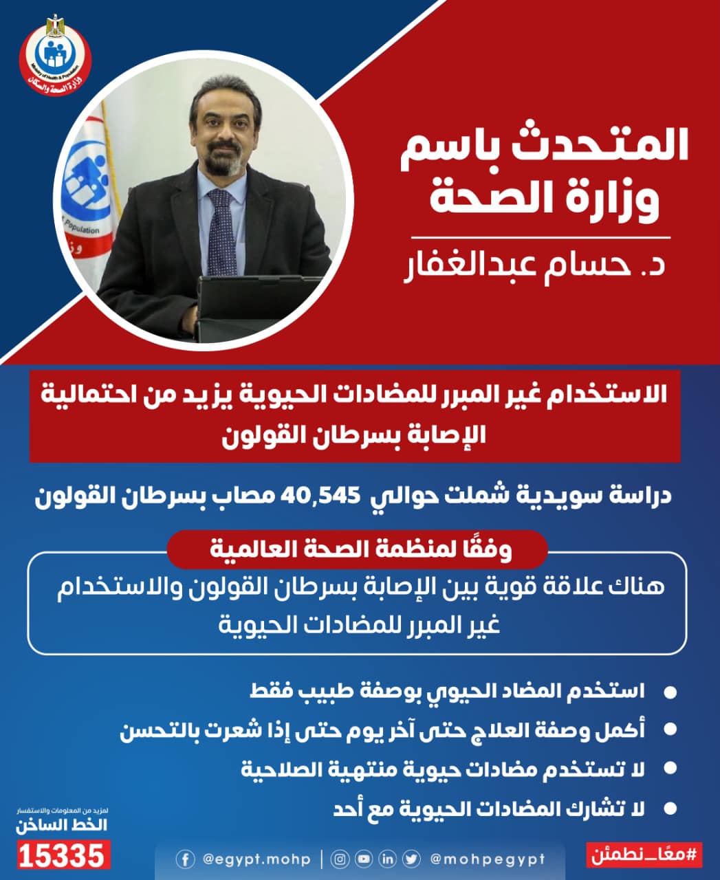 وأوضح حسام عبد الغفار، في بيان نشره على صفحته الرسمية بموقع التواصل الاجتماعي “فيس بوك”، أن دراسة سويدية شملت أكثر من 40 ألف مصاب بسرطان القولون أكدت أن الاستخدام غير المبرر للمضادات الحوية يزيد من خطر الإصابة بهذا النوع من السرطان.