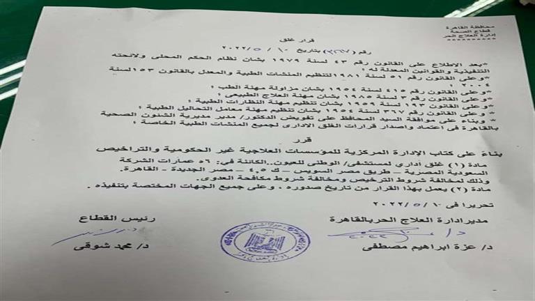 وجاء نص قرار وزارة الصحة الممهور بتوقيع كل من الدكتورة عزة إبراهيم مدير إدارة العلاج الحر بالقاهرة والدكتور محمد شوقي رئيس القطاع كالتالي: