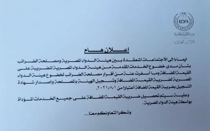 أعلنت هيئة الدواء المصرية عن خضوع كافة خدماتها لضريبة القيمة المضافة بقيمة 14%، وبدء تحصيلها اعتبارا من أول أغسطس الجاري، وذلك بعد اجتماعات ضمت ممثلي الهيئة مع ممثلي مصلحة الضرائب.