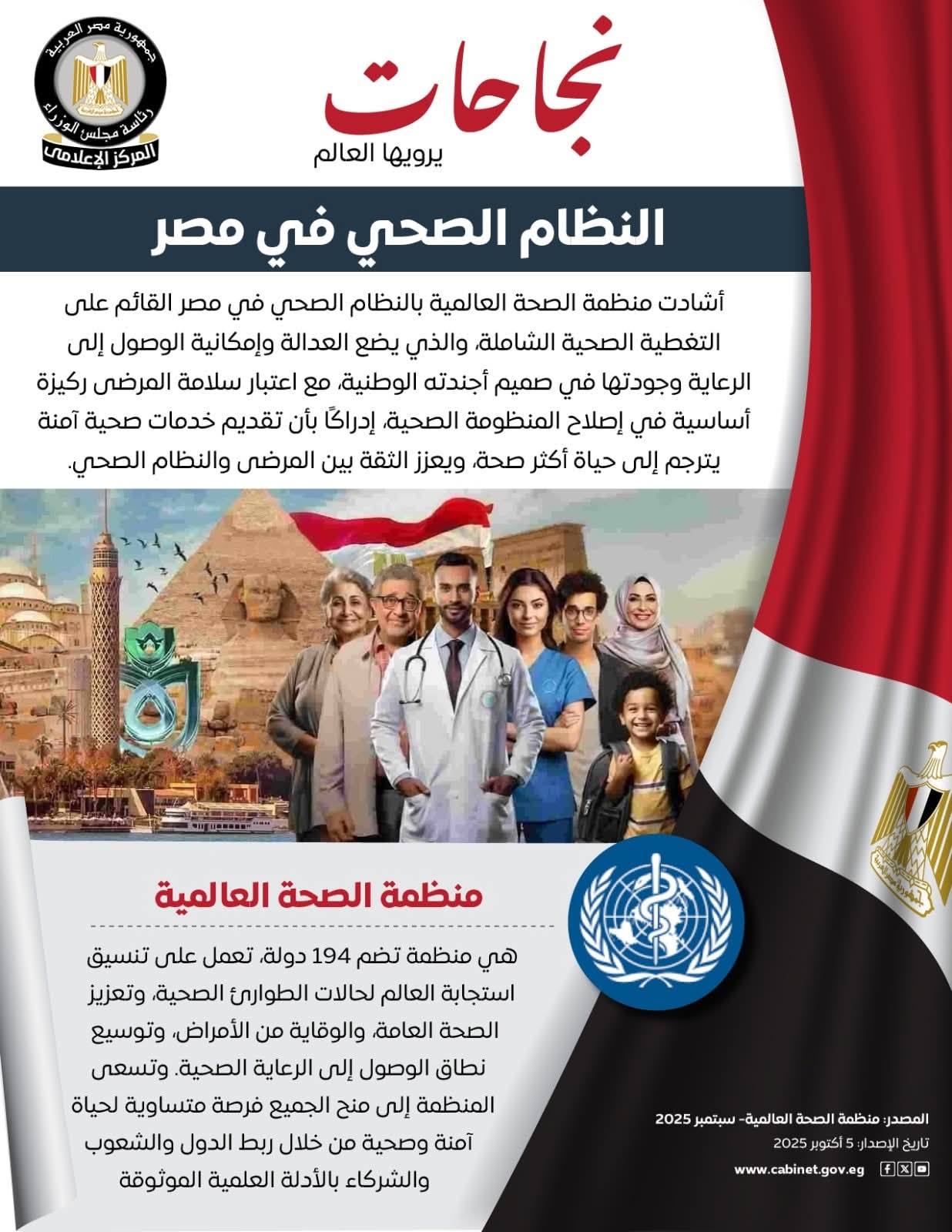 وأكدت منظمة الصحة العالمية أن هذه الخطوة تمثل نموذجًا مستدامًا لتعزيز الثقة وجودة الرعاية الصحية في مصر، وتعكس التزام الدولة برؤية شاملة تهدف إلى الارتقاء بمستوى الخدمات الطبية المقدمة للمواطنين.