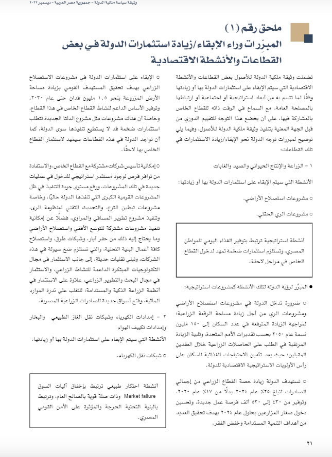 نشر مجلس الوزراء، أهم ملامح وثيقة سياسة ملكية الدولة المصرية للأصول، بما يشمل هدف هذه السياسة، وأهم موجهاتها، ومنهجية تحديد قرارات الإبقاء على أو التخارج من الأصول المملوكة للدولة خلال الفترة المقبلة.