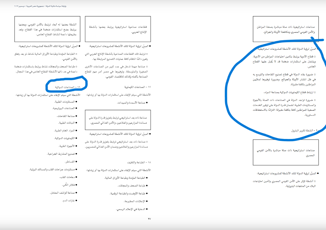 وأضافت الوثيقة أنه فيما يتعلق بالصناعات الدوائية، فإن الأنشطة التي سيتم الإبقاء على استثمارات الدولة بها أو زيادتها، هي المستلزمات الطبية، والصناعات البيولوجية، وصناعة اللقاحات، والنباتات الطبية، والمواد الخام الطبية، والكيماويات الدوائية، والأجهزة الطبية، وتصنيع المشارط الجراحية، والقساطر، ومستلزمات جراحات القلب، والمسالك البولية، ودعامات القلب، وفلاتر الكلى، وصناعة كواشف المعامل، وغازات الدم، باعتبارهم صناعات استراتيجية ذات صلة مباشرة بصحة المواطن والأمن القومي المصري ومكافحة الأوبئة والجوائح.