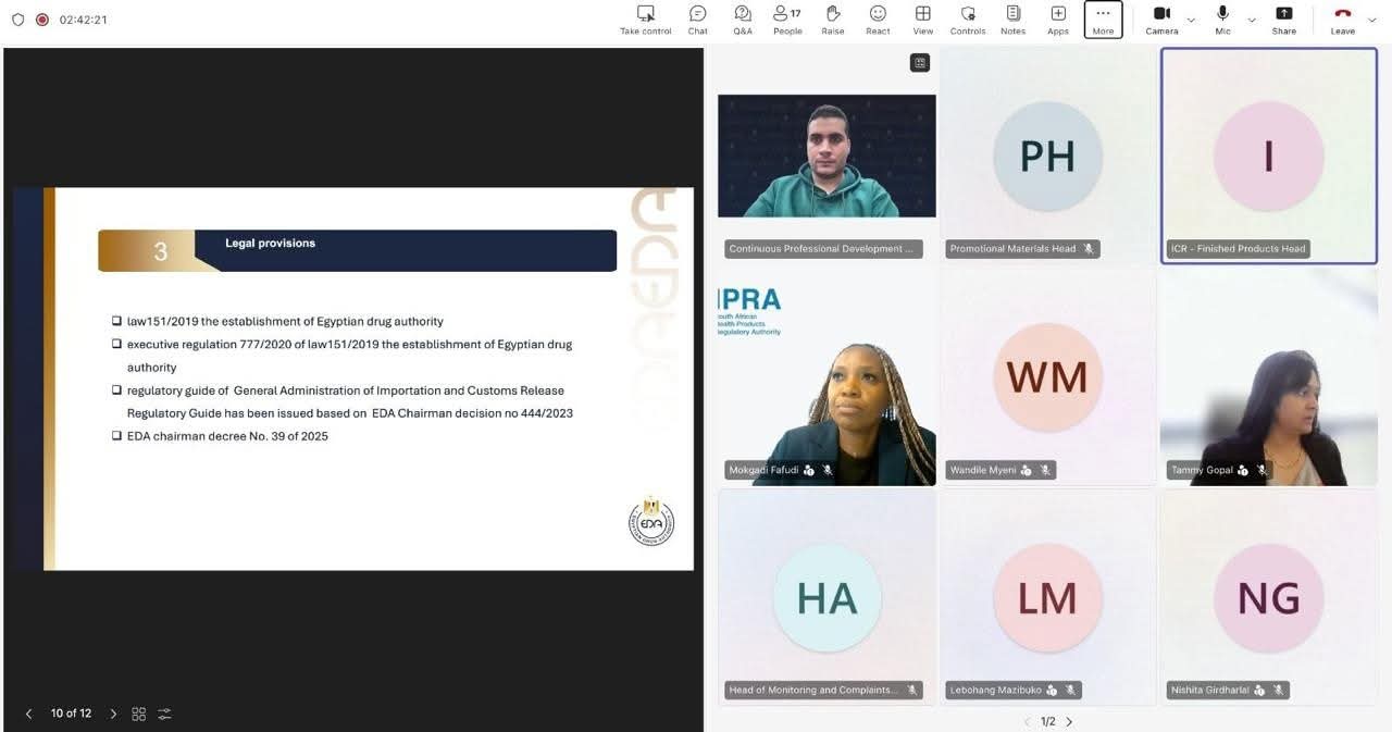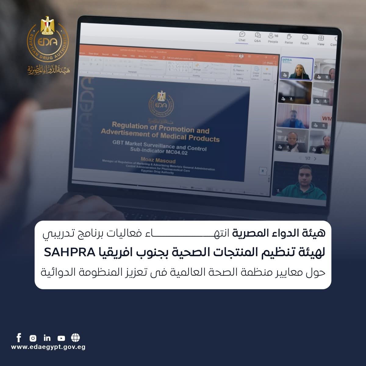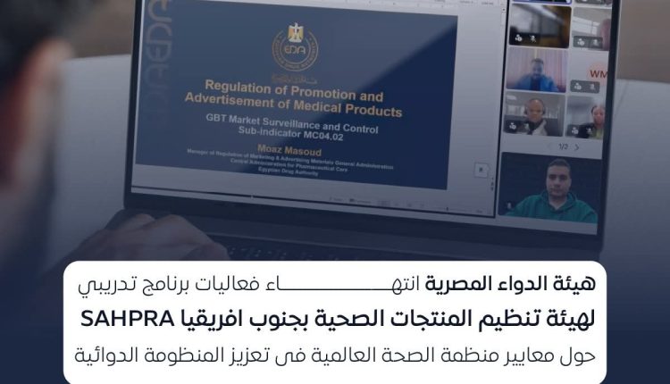أعلنت هيئة الدواء المصرية عن انتهاء فعاليات البرنامج التدريبي حول تنظيم الإعلان عن المنتجات الطبية وإجراءات الاستيراد والإفراج الجمركي، والمقدم لهيئة تنظيم المنتجات الصحية بجنوب أفريقيا (SAHPRA) عبر تقنية “الفيديو كونفرانس”، وذلك في إطار تعزيز التعاون بين سلطات الرقابة الدوائية بالقارة الأفريقية وفقاً لمتطلبات منظمة الصحة العالمية.
