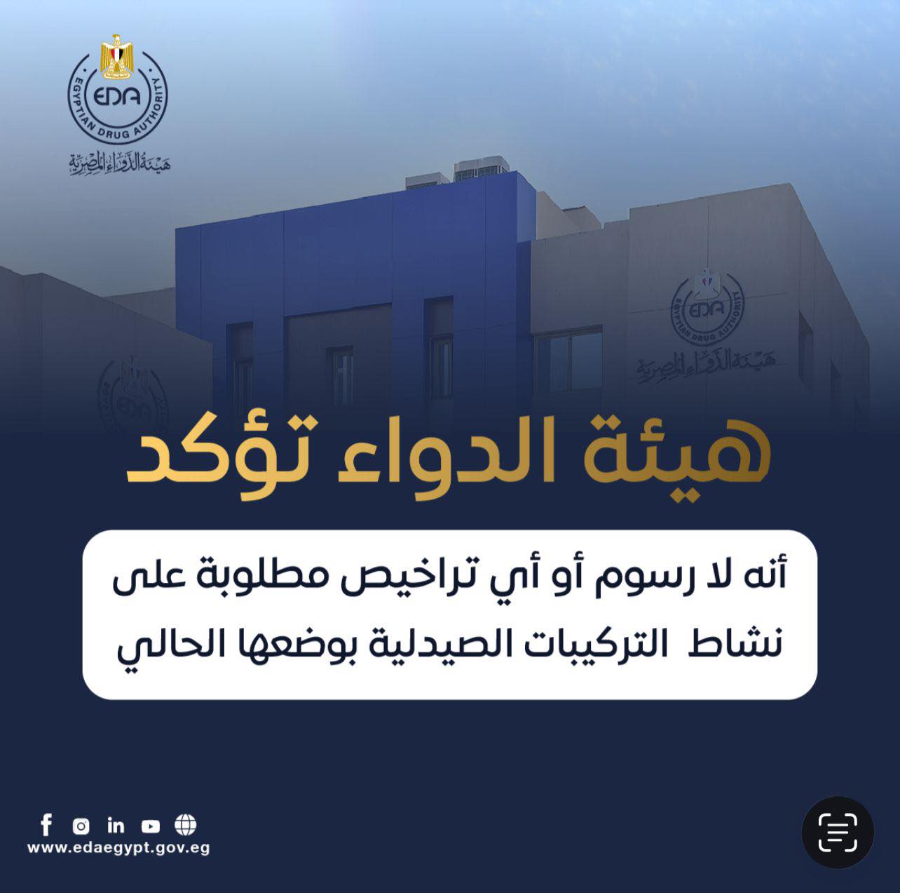 توضح هيئة الدواء المصرية أن القرار 868 لسنة 2025 لا يتعلق بالتركيبات الصيدلية الحالية التي يتم تحضيرها داخل الصيدليات المرخصة، ولن يتم تحصيل أي مقابل خدمات أو مبالغ مالية لاستمرار أو بدء مزاولة هذا النشاط القائم حاليا بالصيدليات والمتعارف عليه بالتركيبات الدوائية المختلفة التى يقوم بها الصيادلة وفقا لقانون 127 لسنة 1955.