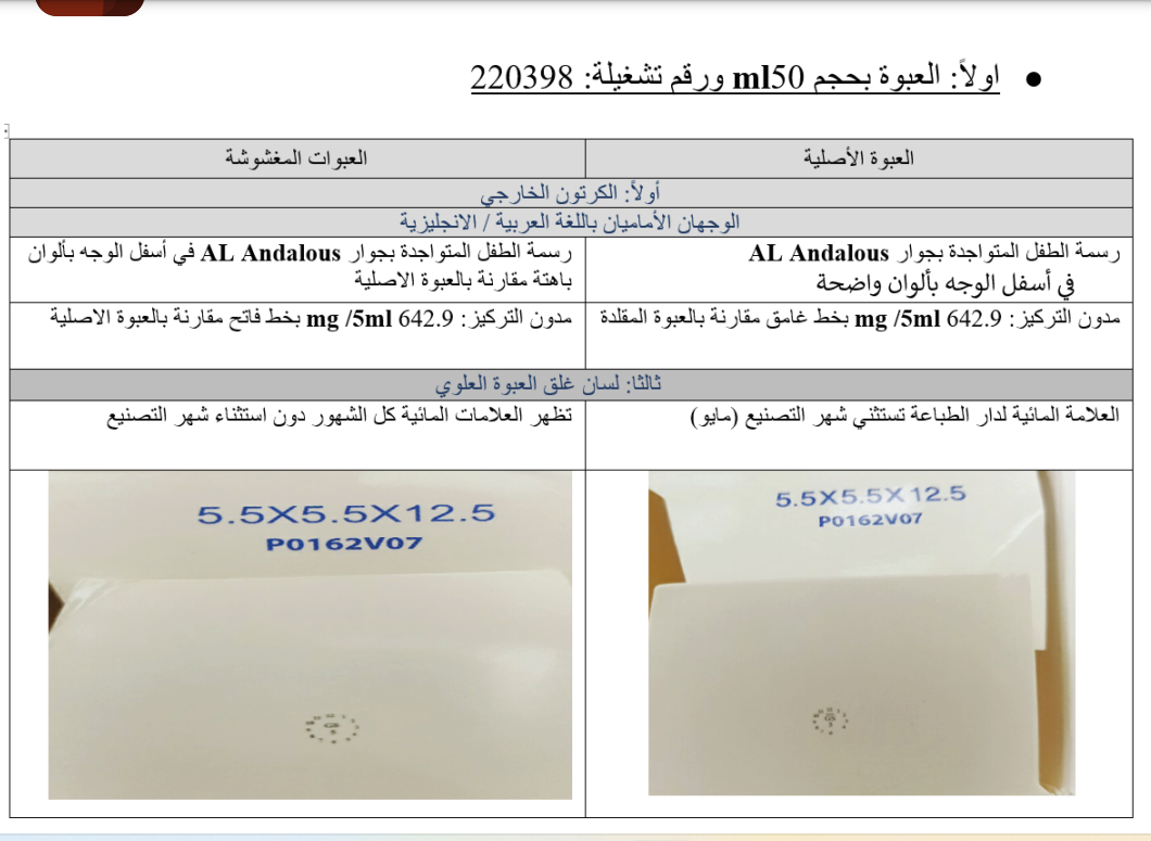 وأضافت أن الزجاجة الأصلية أقل طولا مقارنة بالعبوة المغشوشة، وفيما يتعلق بلون المستحضر يعطي معلق أصفر بعد التحضير، والعبوة المغشوشة غير قابل للذوبان “محلول ابيض”.
