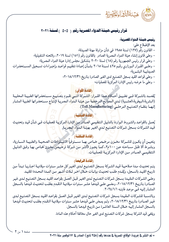 أصدر رئيس هيئة الدواء المصرية، القرار رقم ٥٠٥ لسنة ٢٠٢١، بشأن إعادة صياغة الاشتراطات المطلوبة لقيد شركات التصنيع لدى الغير لفتح مزيد من آفاق التنمية، وذلك في إطار حرص هيئة الدواء المصرية على دعم الاستثمار وتشجيع الصناعة المحلية من خلال الدفع بالشركات الصغيرة والمتوسطة للنمو في سوق الدواء.