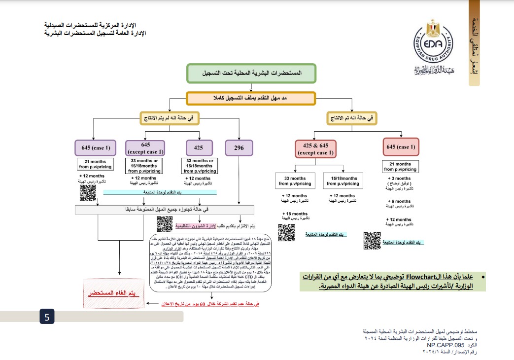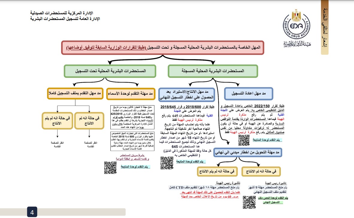أصدرت الإدارة العامة لتسجيل المستحضرات البشرية التابعة للإدارة المركزية للمستحضرات الصيدلية بهيئة الدواء المصرية مخطط توضيحي بمهل المستحضرات البشرية المحلية المسجلة وتحت التسجيل، وذلك طبقا للقرارات الوزارية المنظمة لسنة 2024.