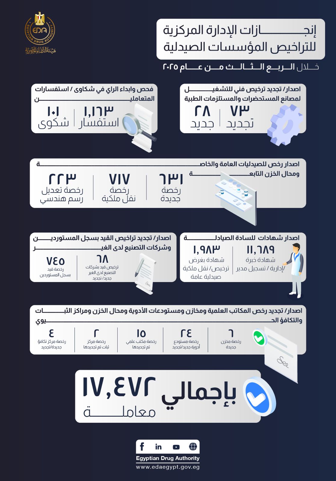 وأكد الدكتور تامر الحسيني، نائب رئيس هيئة الدواء المصرية والمشرف على الإدارتين المركزيتين للتفتيش وتراخيص المؤسسات الصيدلية، أن الهيئة تسعى دائمًا لتعزيز كفاءة منظومة التراخيص ودعم القطاع الصيدلي والصناعي في مصر، مع التركيز على أعلى معايير الجودة والشفافية في خدماتها لضمان وصول الأدوية والخدمات الصيدلية إلى المستفيدين بكفاءة وأمان.