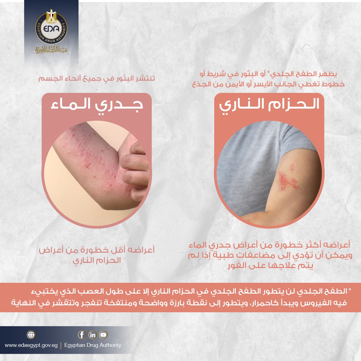 وأوضجت هيئة الدواء أن هناك فارق بين الحزام الناري الذي يظهر في صورة شريط أو خطوط من البثور تغطي الجانب الأيسر أو الأيمن من الجذع، بينما جدري الماء، تنتشر البثور في جميع أنحاء الجسم.