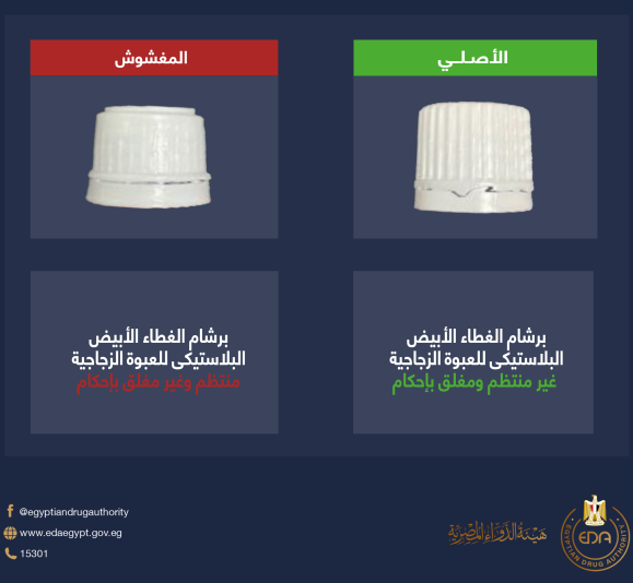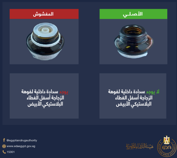 وأشارت الهيئة أن العبوات الأصلية لهذا المستحضر يمكن التفرقة ظاهريا بينها وبين العبوات المغشوشة كالتالي: