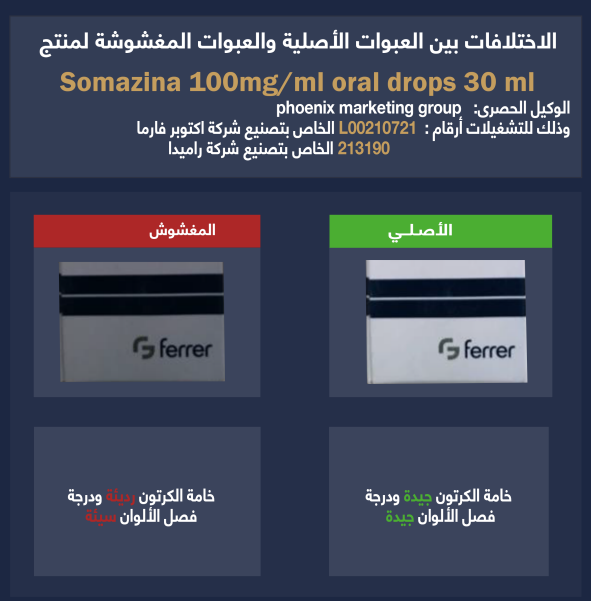 أصدرت هيئة الدواء منشورها الدوري رقم 10 لسنة 2022 بضبط وتحريز العبوات غير المطابقة للمواصفات أو المقلدة أو المغشوشة من مستحضر Somazina 100mg/ml oral drops 30ml، الذي يستخدم في علاج الجهاز العصبي، ووكيله الحصري هو phoenix marketing group.